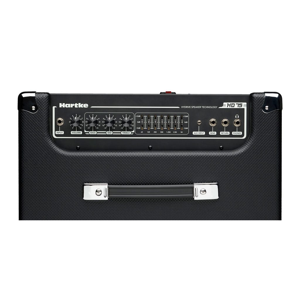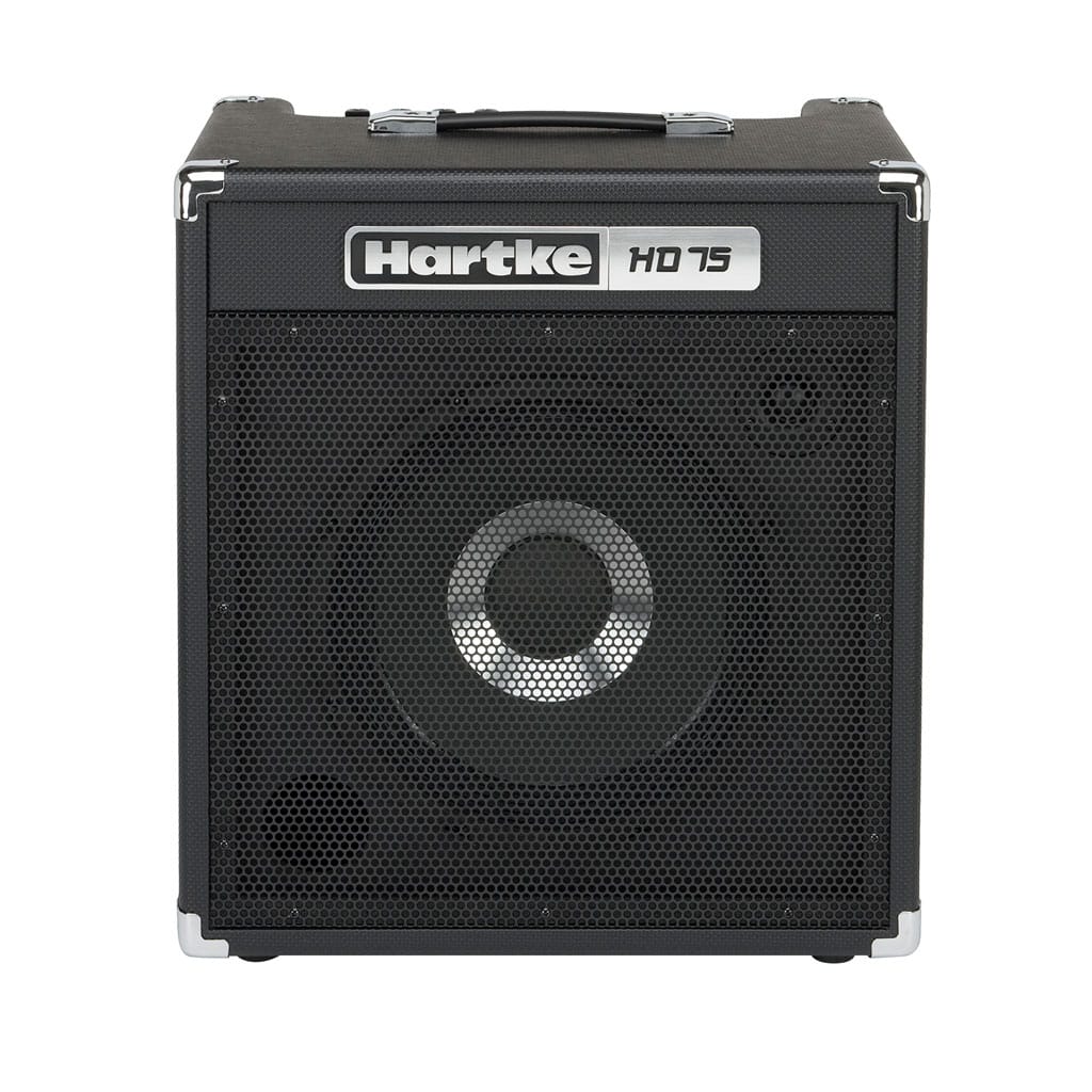The HD75 (75 watts, 12″ driver, 1″ tweeter) employs Hartke’s patented HyDrive Speaker Technology that offers a carefully crafted hybrid (half paper, half aluminum) cone bass speaker. By combining the warmth and roundness of paper with the punch and attack of aluminum, the HyDrive design produces serious tone that is ideal for bass players of all genres and styles. Packed with professional features, the HD75 combo is designed to be user-friendly and reliable for players of all levels. The combo offers Volume, Bass, Mid and Treble controls on its top-mounted amplifier panel, as well as a 7-band graphic EQ, allowing for easy adjustments. It features a full effects loop, as well as an 1/8″ stereo Aux input for playing along with your favorite tracks via an MP3 player and a 1⁄4″ headphone output for more intimate practice sessions. In addition, the HD75 has a built-in limiter to ensure constant amp operation at safe levels. Lastly, its solid enclosure is finished in a stylish fashion with a sleek, perforated metal grille and molded strap carry handle.